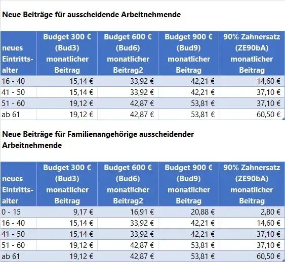 Das gilt sowohl für den eigenen Vertrag des/der Arbeitnehmenden sowie für ggf. bereits bestehende Verträge mitversicherter Familienangehörige. Der Beitrag wird pro Person zum Alter bei Austritt neu kalkuliert; Beitragsrabatte aus dem Gruppenvertrag des Arbeitgebers entfallen.